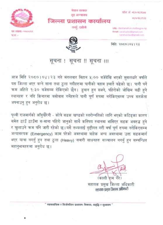 मंगलवार प्रमुख जिल्ला अधिकारी छविलाल रिजालले सूचना जारी गर्दै डुबान हुन सक्ने, पहिरोको जोखिम बढी हुने स्थानहरु र नदि किनारमा बसोवास गर्नेहरूले पानी पूर्ण रूपमा नरोकिएसम्म उच्च सतर्कता अपनाउन आग्रह गरेको छ ।