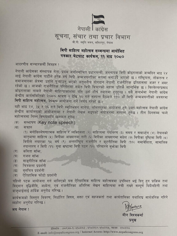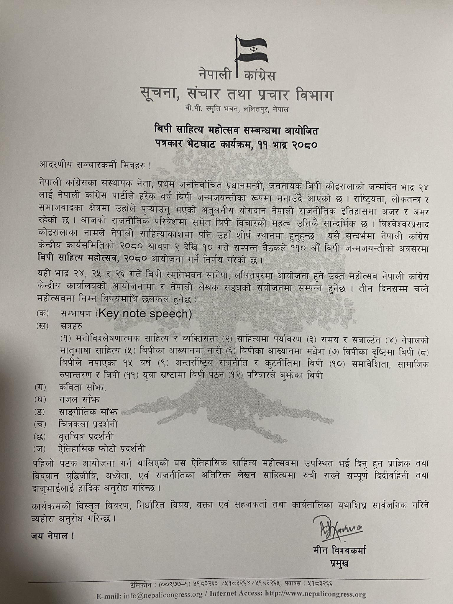 गएको साउनमा भएको केन्द्रीय कार्यसमिति बैठकबाट बीपी साहित्यिक महोत्सव गर्ने निर्णय गरिएको थियो । पार्टी केन्द्रीय कार्यालय सानेपामै महोत्सव हुनेछ ।
