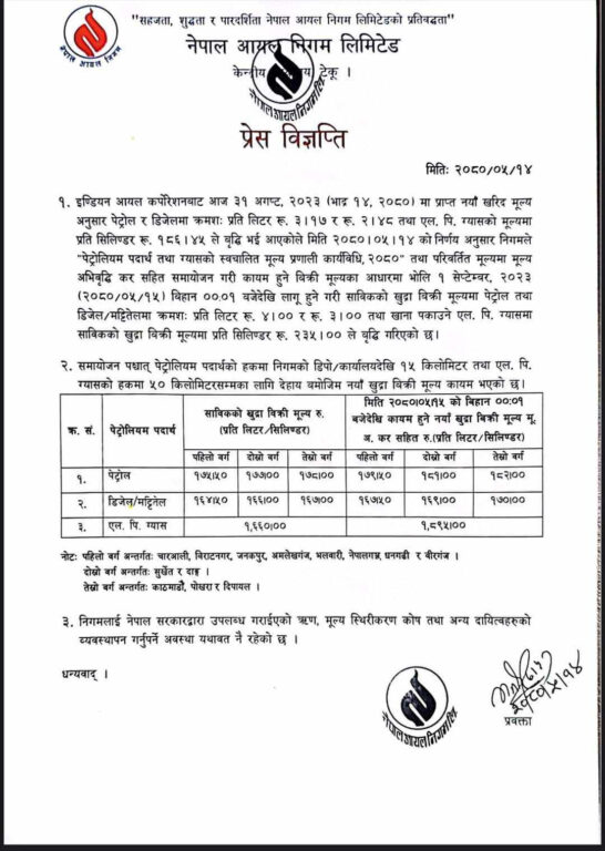 नयाँ मूल्य आज रातिबाट लागु हुने छ । यसअघि साउन ३० गते पेट्रोलियम पदार्थको मूल्य बढाइएको थियो ।