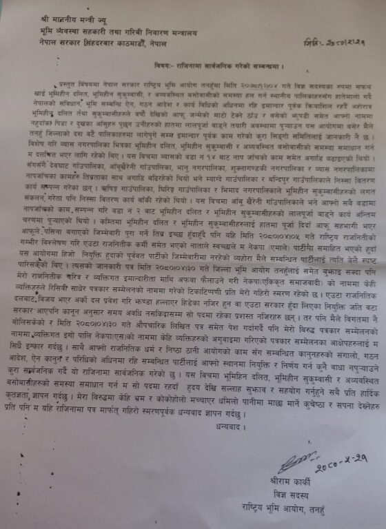एकीकृत समाजवादीको सिफारिसमा सदस्य नियुक्त भएता पनि पार्टी परिवर्तन गरिसकेपछि पदमा बस्न उपयुक्त नठानी राजीनामा दिएको कार्कीले जनाएको छ।