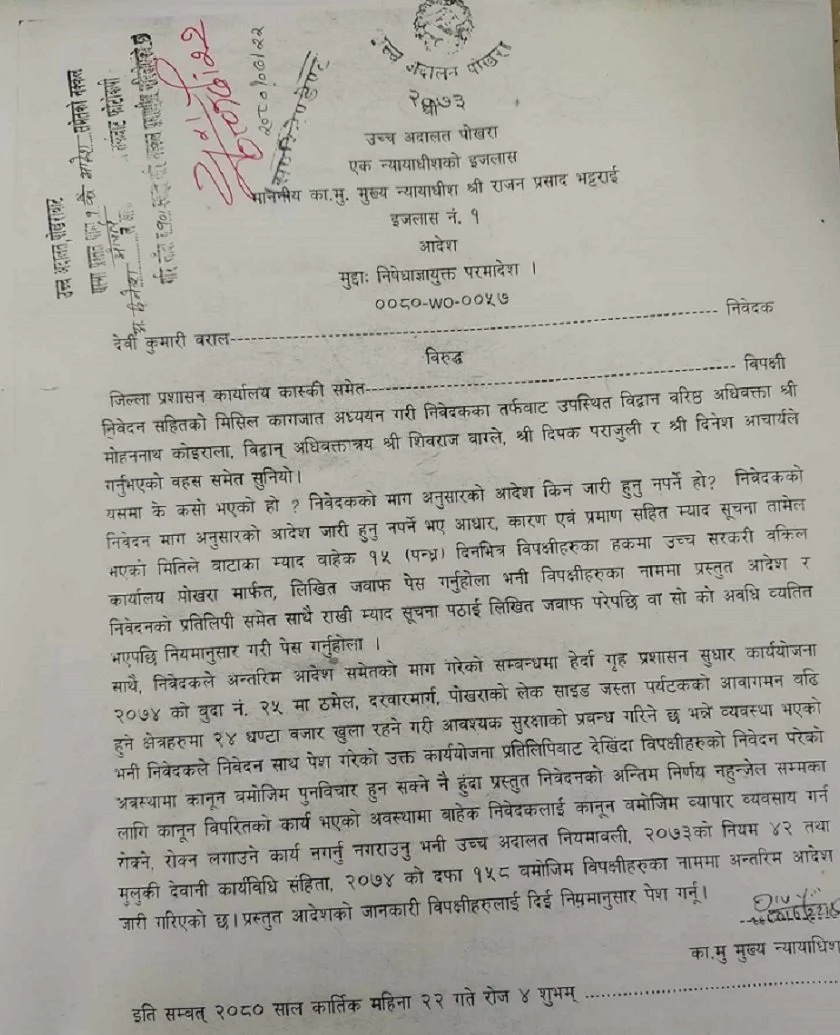 व्यवसायीले व्यवसायमा अङ्कुश लगाउने गरी प्रहरीले दिएको समस्या विरुद्ध रिट दिएका थिए । देवीकुमारी बरालले दिएको रिटमा कामु मुख्य न्यायाधीश राजनप्रसाद भट्टराईले यस्तो आदेश दिएका हुन् ।