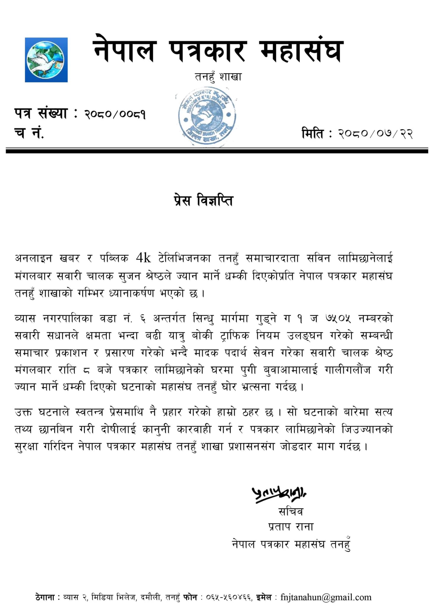 दमौली : समाचारको विषयलाई लिएर अनलाइन खबर र पब्लिक फोरके टेलिभिजनका तनहुँ संवाददाता सविन लामिछानेलाई सवारी चालकले धम्क्याएकोप्रति नेपाल पत्रकार महासंघ तनहुँले गम्भीर ध्यानाकर्षण भएको जनाएको छ ।
