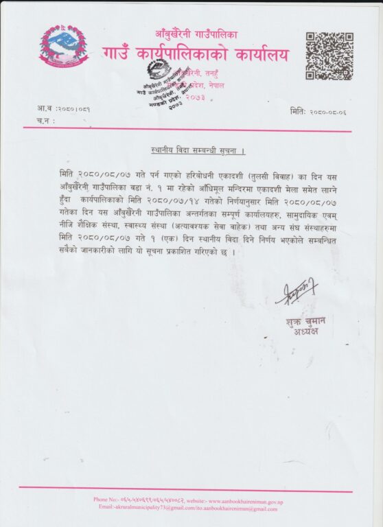 मंसिर ७ गते परेको हरिबोधिनी एकादशीको अवरसमा आँबुखैरेनी गाउँपालिकाले सार्वजनिक बिदा दिने निर्णय गरेका हुन् ।