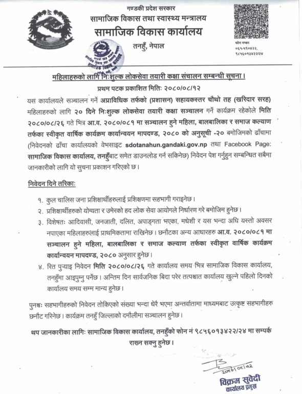 दमौली : सामाजिक विकास कार्यालय तनहुँले निजामती सेवामा महिलाको पहुँच पुर्याउन निःशुल्क लोक सेवा तयारी कक्षा सञ्चालन गर्ने भएको छ ।