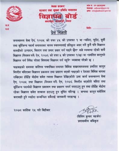 विज्ञापन बोर्डले यही कात्तिक २५ गते विज्ञप्ति प्रकाशित गरेको थियो । सञ्चारमाध्यममा रक्सीलगायत वस्तुकाे विज्ञापन प्रकाशन भए विज्ञापन प्रसारण गर्ने पत्रपत्रिका, विज्ञापन एजेन्सी र विज्ञापन दातालाई कानुनअनुसार कारबाही समेत हुने विज्ञप्ति मार्फत जानकारी गराइएको छ ।