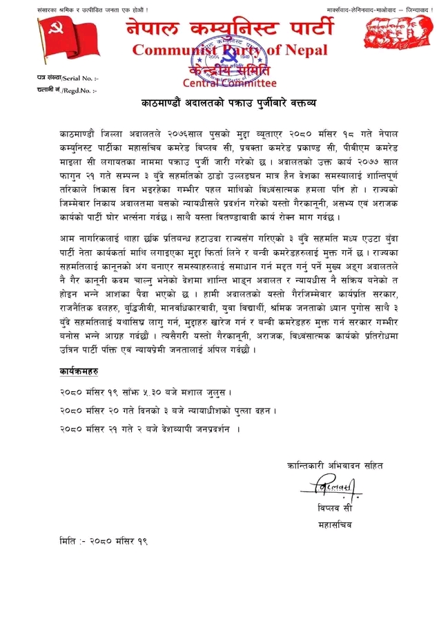 काठमाडौं जिल्ला अदालतले २०७६ साल पुसको मुद्दा व्यूताएर सोमबार नेपाल कम्युनिस्ट पार्टीका महासचिव विप्लव सी, प्रवक्ता प्रकाण्ड सी, पीवीएम माइला सी लगायतका नाममा पक्राउ पुर्जी जारी गरेको थियो । अदालतको उक्त आदेश २०७७ साल फागुन २१ गते सम्पन्न ३ बुँदे सहमतिको ठाडो उल्लङघन मात्र नभई देशका समस्यालाई शान्तिपूर्ण तरिकाले निकास दिन भइरहेका गम्भीर पहलमाथिको विध्वंसात्मक हमला भएको नेकपाको ठहर छ।