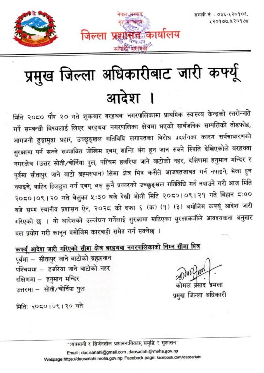सर्लाही : सर्लाहीको बरहथवामा कर्फ्यू आदेश जारी गरिएको छ । प्रमुख जिल्ला अधिकारी कोमलप्रसाद धमलाले शुक्रबार कर्फ्यू आदेश जारी गरेका हुन् । शुक्रबार बेलुका ५ः३० बजेदेखि शनिबार बिहान ८ बजेसम्म कर्फ्यू आदेश जारी गरिएको हो ।