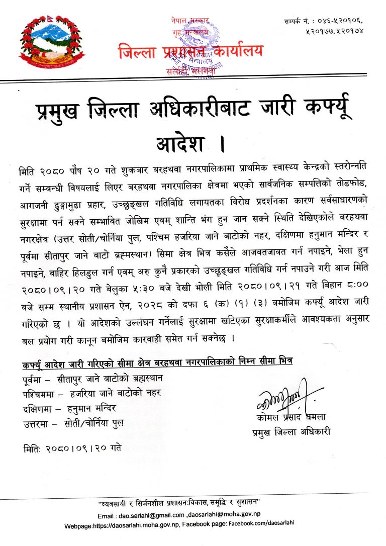 बरहथवा नगरक्षेत्र पूर्वमा सीतापुर जाने बाटो ब्रह्मस्थान, पश्चिममा हजरिया जाने बाटोको नहर, दक्षिणमा हनुमान मन्दिर र उत्तरमा सोती÷चोर्निया पुल क्षेत्रभित्र कर्फ्यू आदेश गरिएको छ ।