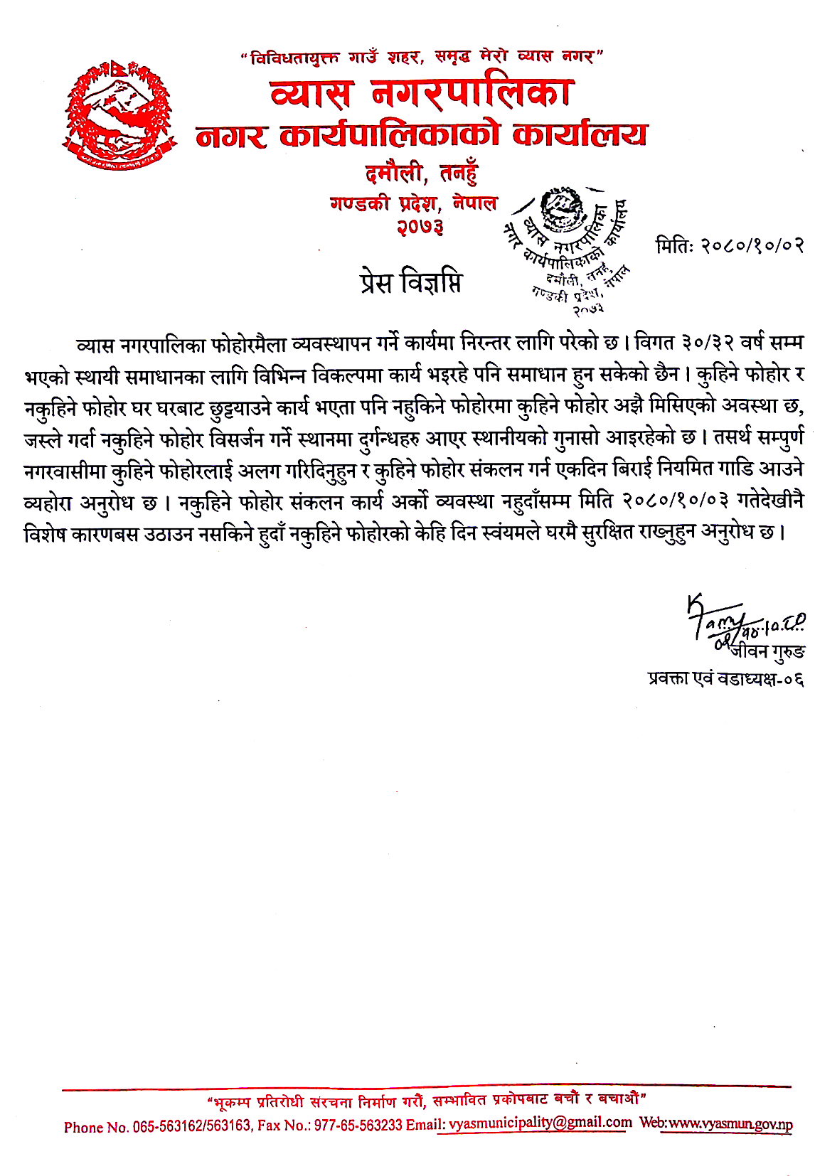 नकुहिने फोहरको केही दिन व्यक्ति स्वयमंले घरमै सुरक्षित राख्न अनुरोध गर्दै नगरपालिकाले फोहोरमैला व्यवस्थापन गर्ने कार्यमा निरन्तर लागि परेको जानेको छ।