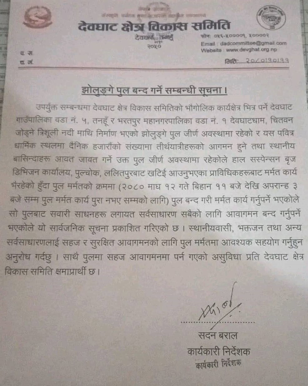 देवघाट क्षेत्र विकास समितिले आज एक विज्ञप्ती जारी गर्दै दिउँसो ११ बजेदेखि तीन बजेसम्म आवागमन बन्द गरिने जानकारी दिएको छ । यो पुल देवघाट जोड्ने चितवन र तनहुँको एक मात्र पुल हो ।