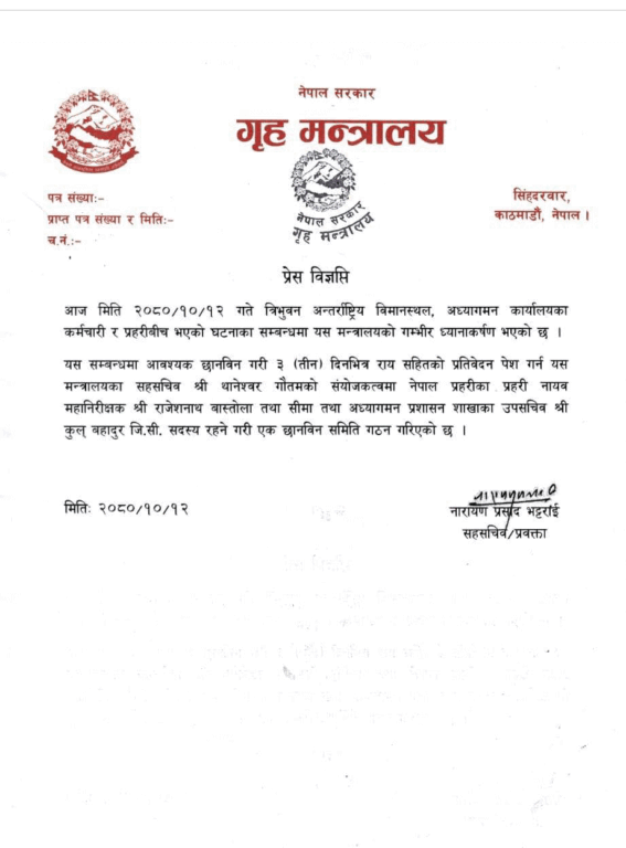 काठमाडौं : त्रिभुवन अन्तर्राष्ट्रिय विमानस्थल, अध्यागमन कार्यालयमा अध्यागमनका कर्मचारी र प्रहरीबीच भएको घटनाका सम्बन्धमा छानबिन गर्न गृह मन्त्रालयले समिति गठन गरेको छ । मन्त्रालयले घटनाबारे गम्भीर ध्यानाकर्षण भएकोसमेत जनाएको छ।
