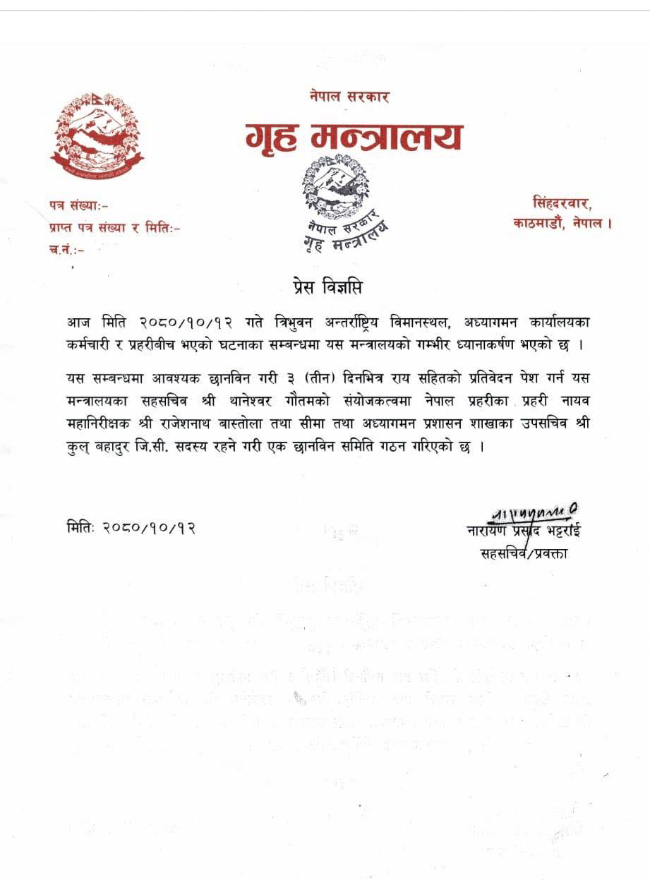 मन्त्रालयका प्रवक्ता नारायणप्रसाद भट्टराईले एक वक्तव्य जारी गर्दै घटनाको आवश्यक छानबिन गरी तीन दिनभित्र प्रतिवेदन पेस गर्न तीन सदस्यीय छानबिन समिति गठन गरिएको जनाएका छन् ।