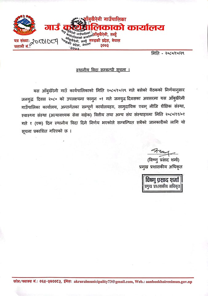 जनयुद्ध दिवस २०८० को उपलक्ष्यमा फागुन १ गते गाउँपालिका कार्यालय, मातहतका कार्यालय, सम्पूर्ण विद्यालयहरू र पालिकाभित्र सञ्चालित सम्पूर्ण बैंक तथा वित्तिय संस्थामा बिदा रहने गाउँपालिकाले जनाएको छ।