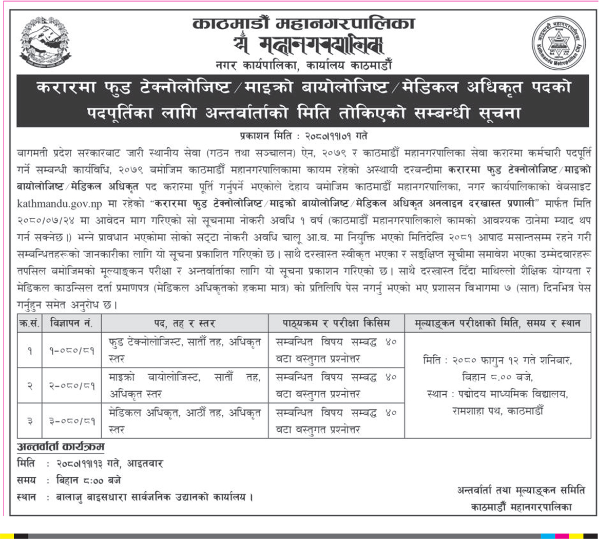 काठमाडौं महानगरपालिकाले फुड टेक्नोलोजिष्ट, माइक्रो बायोलोजिष्ट र मेडिकल अधिकृत पदका लागि आवेदन मागेको छ । रिक्त रहेका यी पदपूर्तिका लागि आवेदन माग गरिएको हो ।