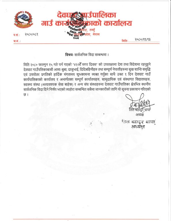 दमौली : तनहुँको देवघाट गाउँपालिकाले मगर दिवसका अवसरमा सार्वजनिक बिदा दिएको छ ।
