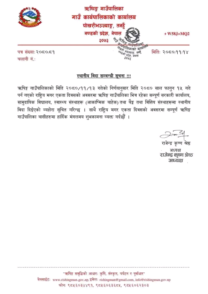 दमौली : तनहुँको ऋषिङ गाउँपालिकाले भोलि मगर दिवसका अवसरमा सार्वजनिक बिदा दिएको छ ।