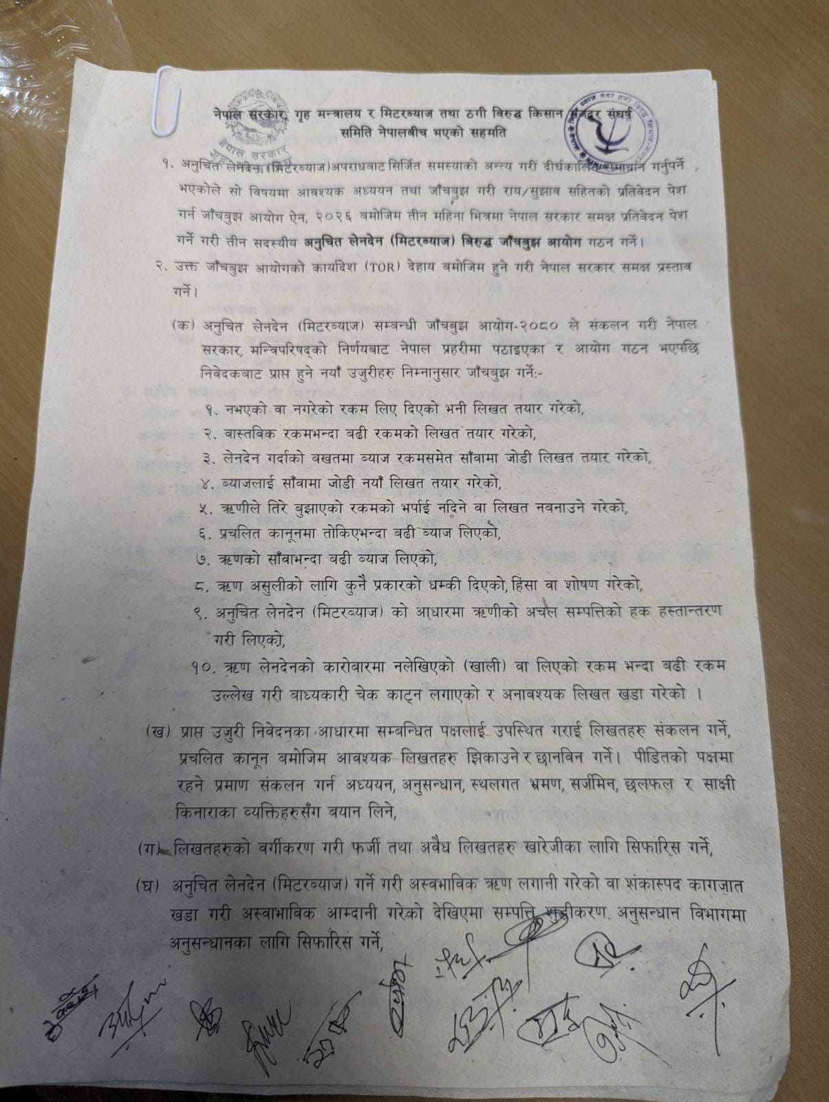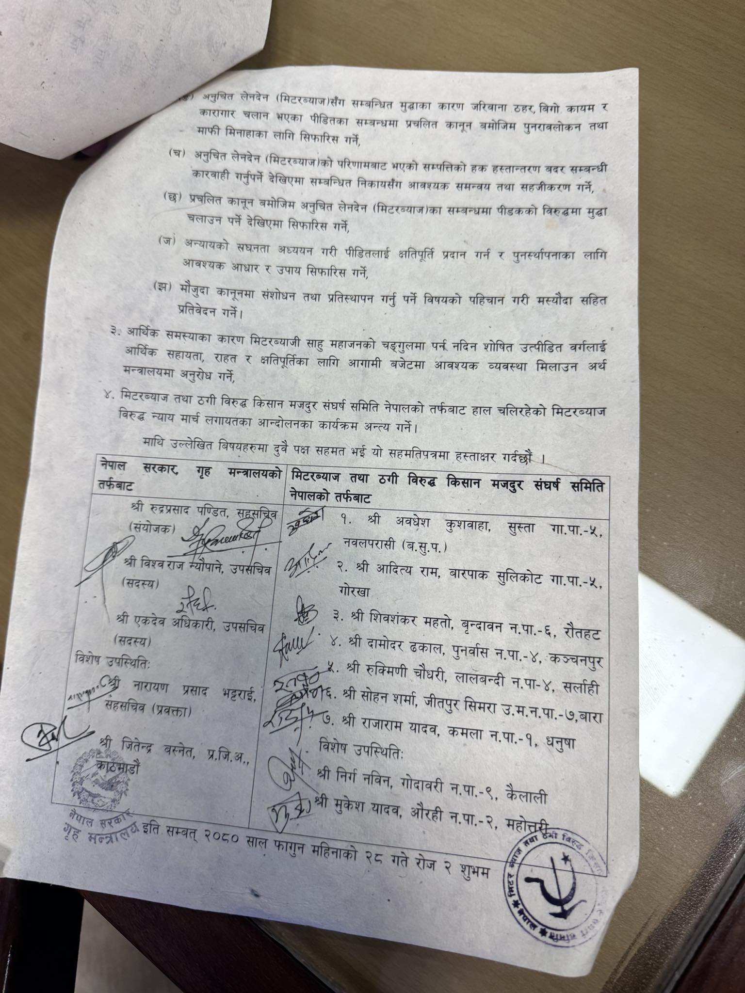 काठमाडौं : सरकार र मिटरब्याजपीडित तथा ठगीविरुद्ध किसान–मजदुर संघर्ष समितिबीच चार बुँदे सहमति भएको छ।