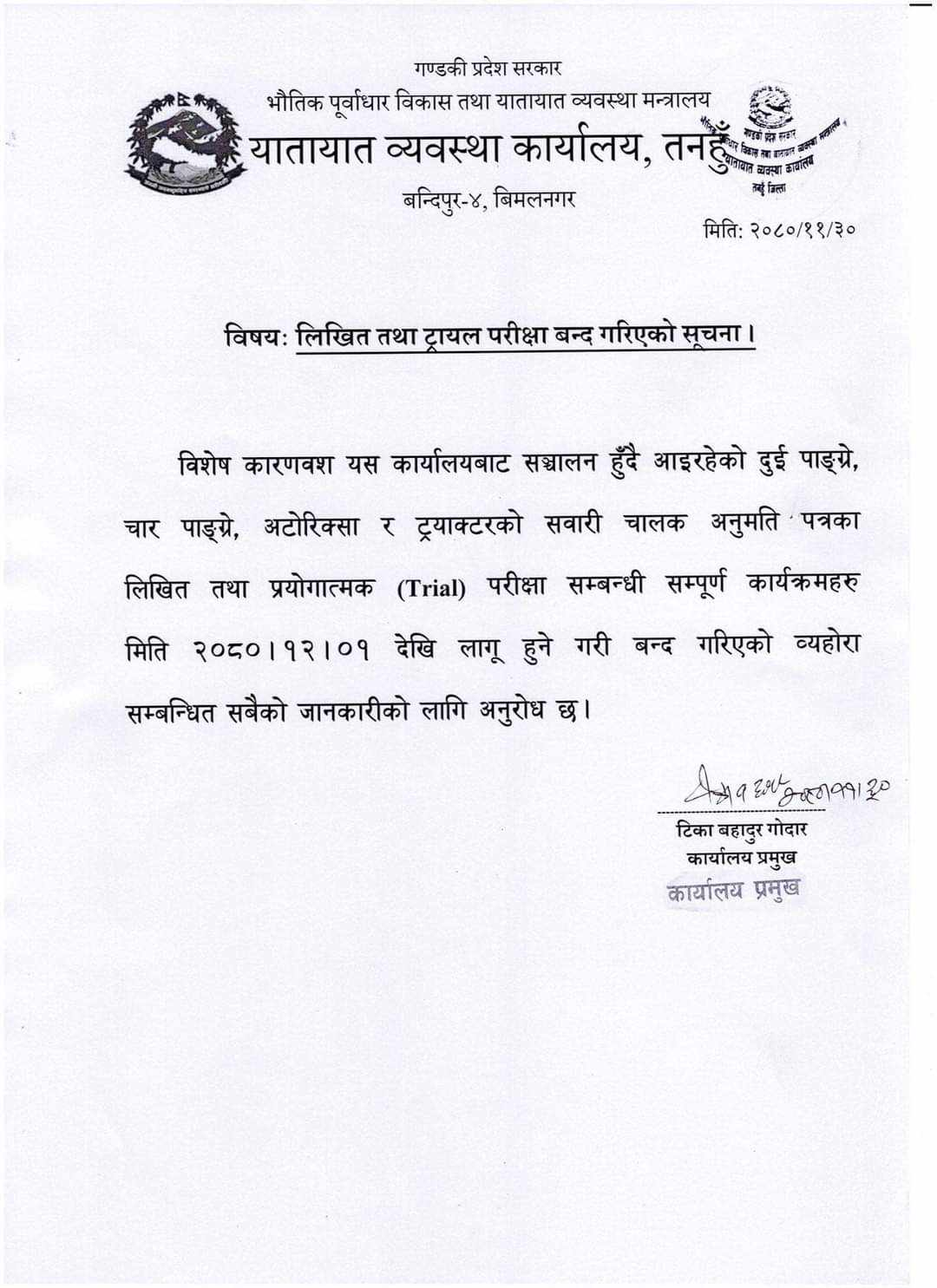विशेषकारणवस चैत १ गतेबाट लागु हुने गरि दुई पांग्रे, चार पांग्रे, अटो रिक्सा तथा ट्याक्टरको सम्पूर्ण लिखित तथा ट्रायल परिक्षा बन्द भएको कार्यालय प्रमुख टिका बहादुर गोदारले जानकारी दिए ।