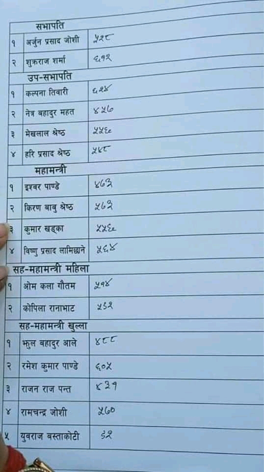 उपसभापतिमा सबैभन्दा मत ल्याउँदै स्याङ्जाकी पौडेल समूहकी कल्पना तिवारी र संस्थापन प्यानलबाट मेखलाल श्रेष्ठ निर्बचित भएका छन् । तिवारीले ६ सय २४ मत ल्याउंदा मेखलाल श्रेष्ठले ५ सय ५६ मत ल्याएका छन् । तिवारी वालिङ नगरपालिकाकी उपमेयर हुन् । तेस्तै संस्थापनबाट म्याग्दीका नेत्र महत र पौडेल पक्षका बागलुङका हरिप्रसाद श्रेष्ठ उपसभापतिमा पराजित भए ।