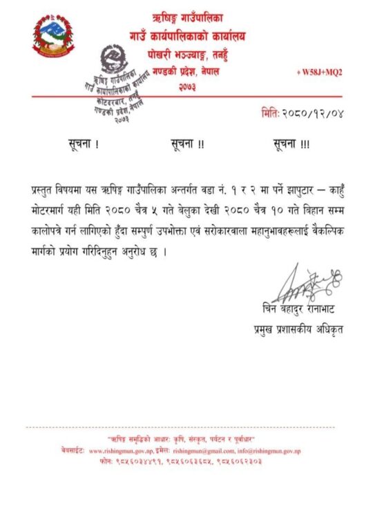 सडक ढलान तथा स्तोरोन्तिका लागि पूर्णरूपमा भोलि ५ गते देखि १० गते सम्म सवारीसाधन आवागमन रोकेर काम अघि बढाउने निर्णय भएको गाउँपालिकाका प्रशासकीय अधिकृत चिन बहादुर रानाभाटले जानकारी दिए ।