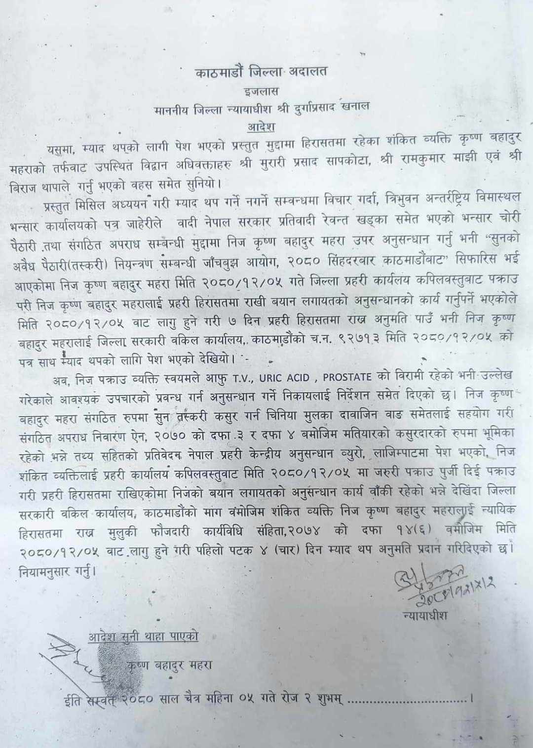 जिल्ला अदालत काठमाडौंले उनलाई ४ दिन हिरासतमा राख्न प्रहरीलाई अनुमति दिँदै स्वास्थ्य अवस्थाका कारण अस्पतालमा राख्न आदेश दिएको छ।