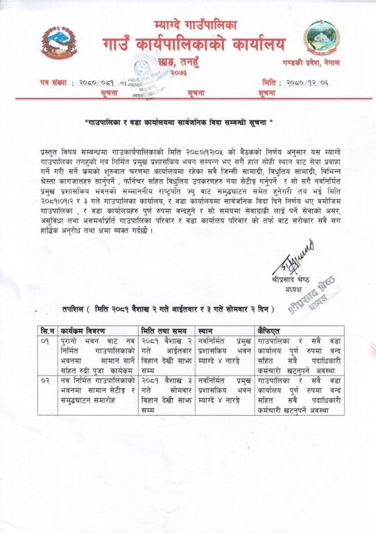 दमौली : तनहुँकाे म्याग्दे गाउँपालिकाले २०८१ साल वैशाख २ र ३ गते सार्वजनिक विदा दिने भएको छ ।