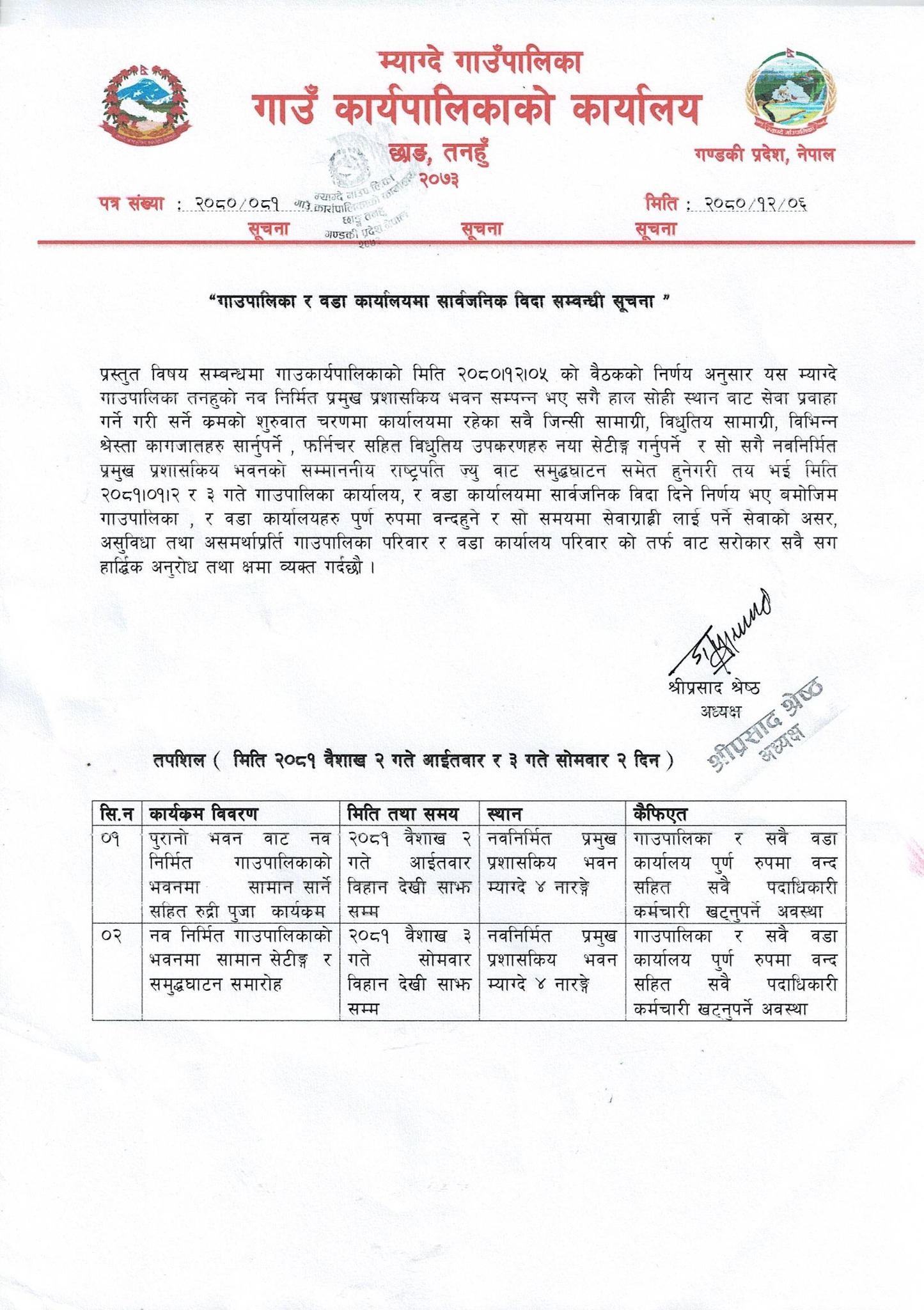गाउँपालिकाकाे नवनिर्मित प्रमुख प्रशासकिय भवन सम्पन्न भए सँगै नयाँ भवन बाट सेवा प्रवाह गर्ने गरि सरसामान सार्ने कामको लागि सार्वजनिक विदा दिने निर्णय भएको गाउँपालिकाका अध्यक्ष श्रीप्रसाद श्रेष्ठले जानकारी दिए ।