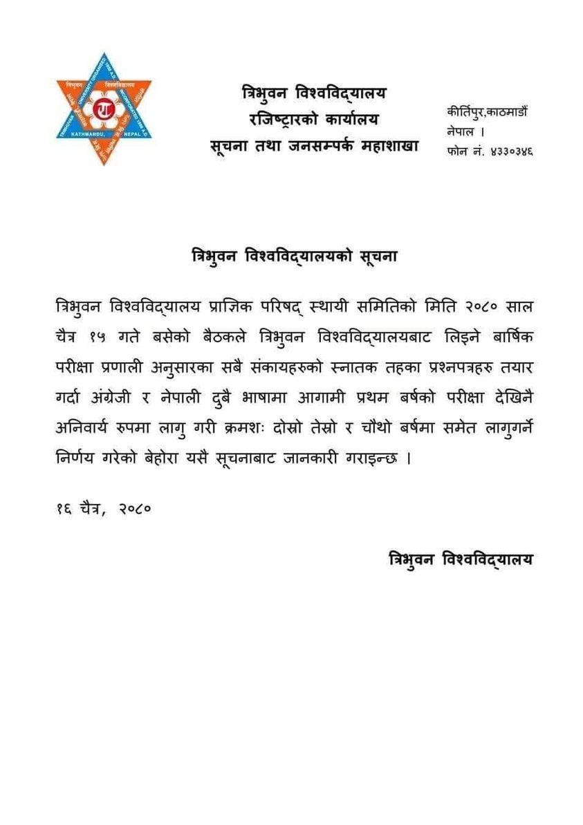 त्रिविले शुक्रबार जारी गरेको सूचनामा भनिएको छ, ‘त्रिभुवन विश्वविद्यालय प्राज्ञिक परिषद् स्थायी समितिको मिति २०८० साल चैत्र १५ गते बसेको बैठकले त्रिभुवन विश्ववि‌द्यालयबाट लिइने वार्षिक परीक्षा प्रणाली अनुसारका सबै सङ्कायहरूको स्नातक तहका प्रश्नपत्रहरु तयार गर्दा अङ्ग्रेजी र नेपाली दुवै भाषामा आगामी प्रथम वर्षको परीक्षा देखिनै अनिवार्य रूपमा लागु गरी क्रमशः दोस्रो तेस्रो र चौथो वर्षमा समेत लागुगर्ने निर्णय गरेको बेहोरा यसै सूचनाबाट जानकारी गराइन्छ ।’