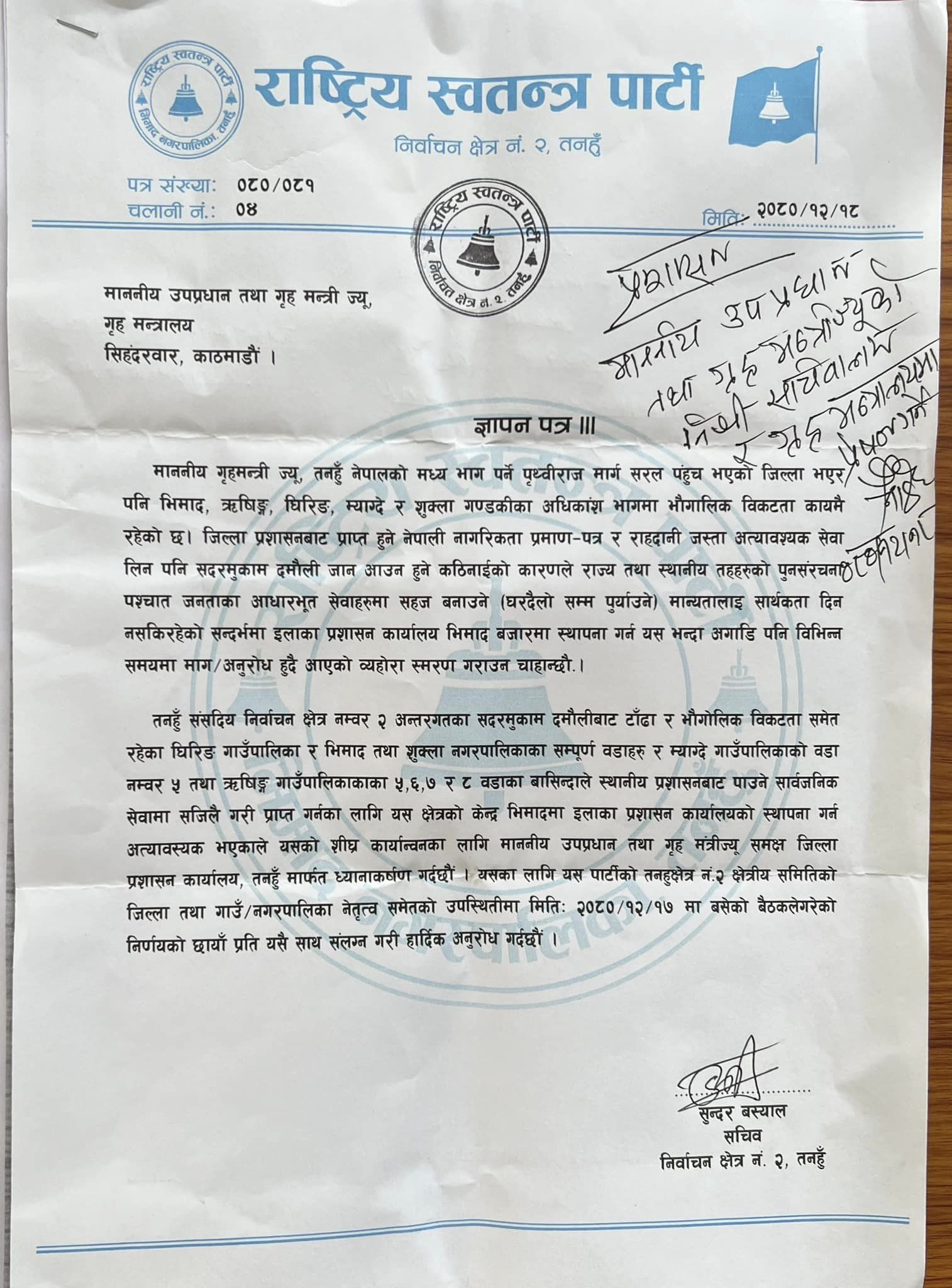रास्वपा तनहुँले आइतवार प्रमुख जिल्ला अधिकारी जनार्दन गौतम मार्फत गृहमन्त्रीलाई ज्ञापन पत्र बुझाउँदै इलाका प्रशासन कार्यालय स्थापना गर्न माग गरेको हो ।