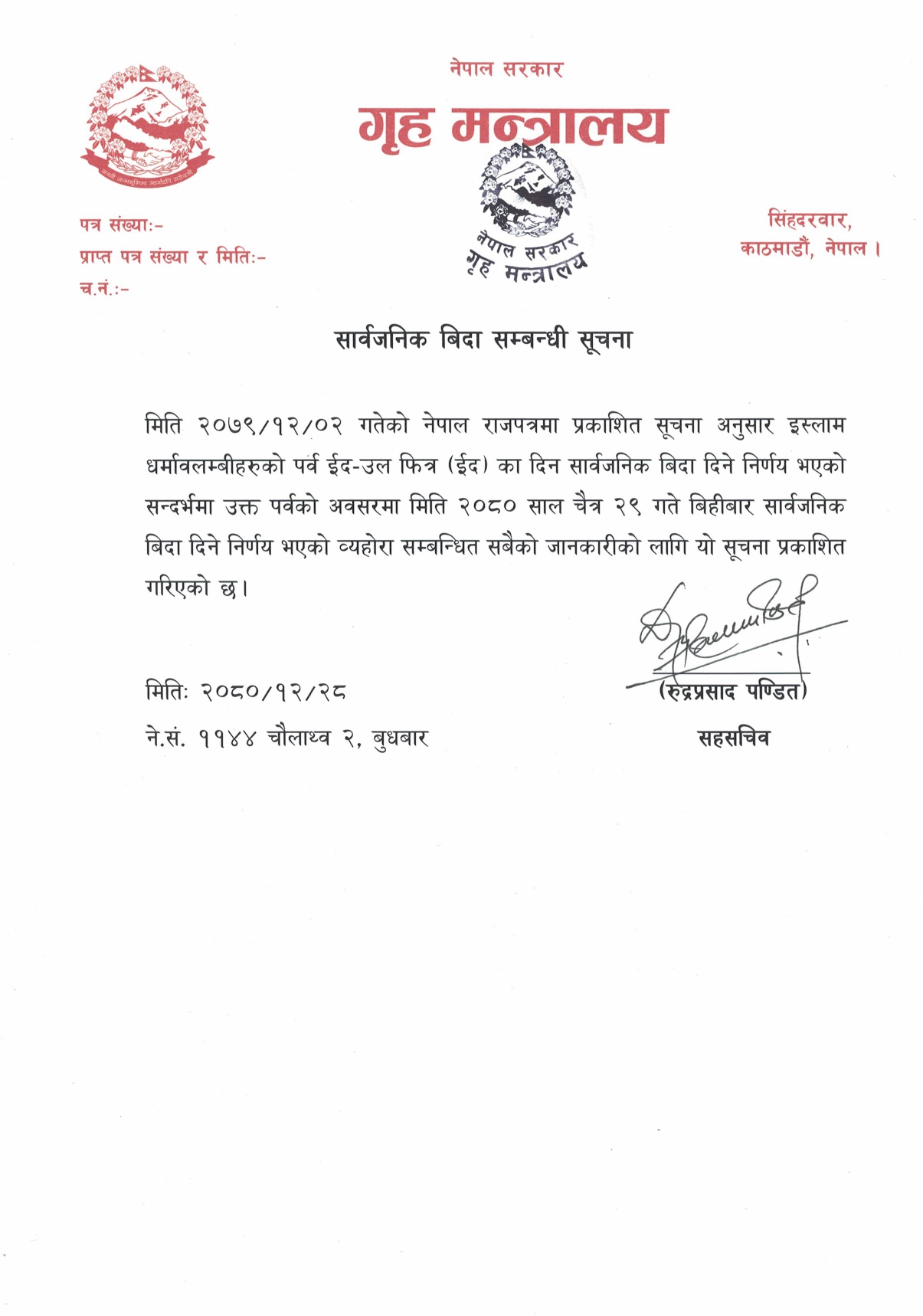 काठमाडौं : सरकारले भोलि सार्वजनिकबिदा दिएको छ । इस्लाम धर्मावलम्बीहरुको पर्व ईद उल फित्र (ईद)को अवसरमा बिहीबार सार्वजनिक बिदा दिइएको गृह मन्त्रालयले जनाएको छ ।