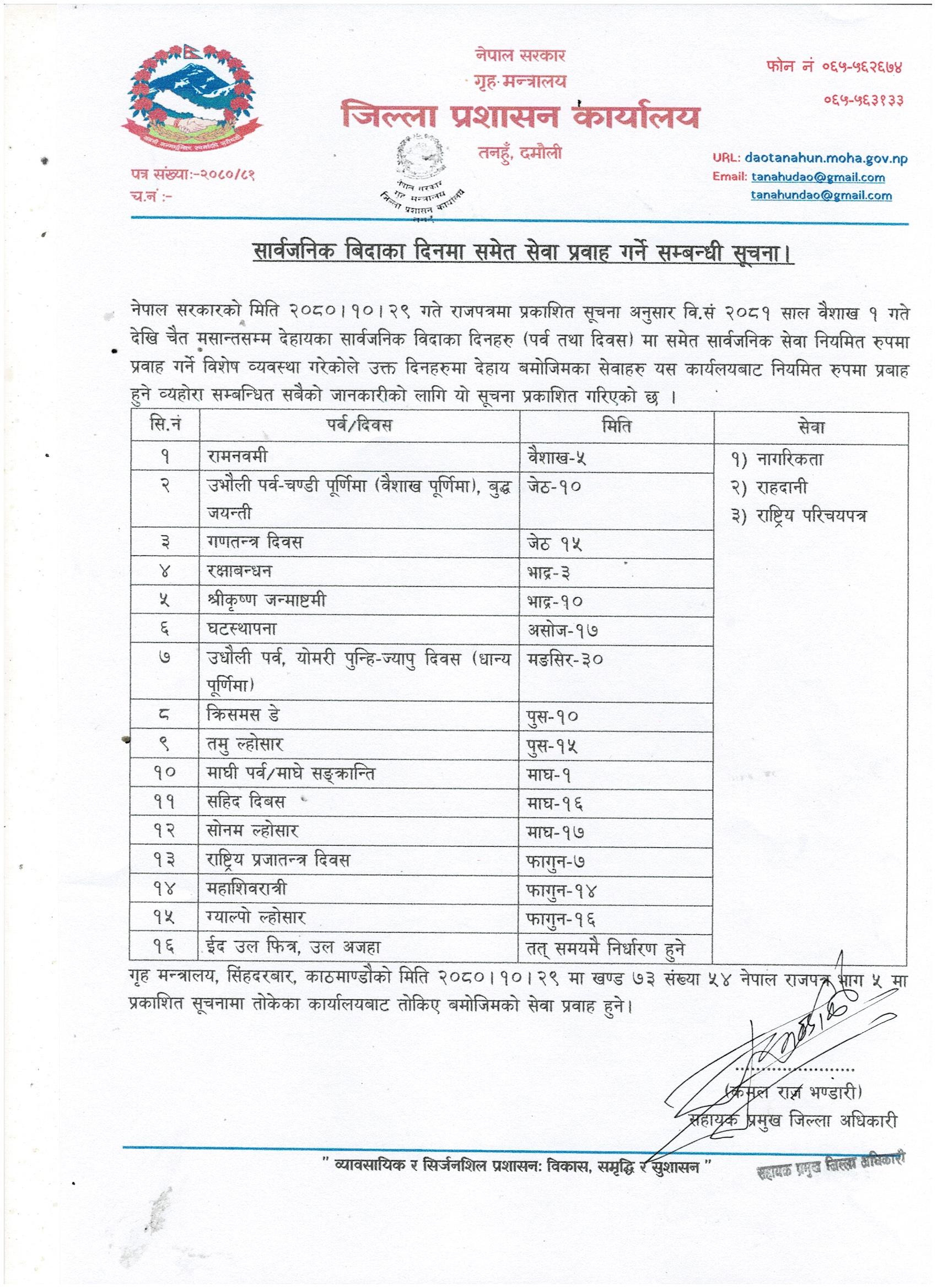 दमौली : जिल्ला प्रशासन कार्यालय तनहुँले भोलिबाट सार्वजनिक बिदाको दिनमा पनि सेवा प्रवाहको विशेष व्यवस्था गरेको छ । चैत २९ गते एक सूचना जारी गर्दै नयाँ वर्ष २०८१ वैशाख ५ गतेदेखि चैतसम्म पर्ने १६ दिनको सार्वजनिक बिदामा नियमित सेवा नरोक्ने जनाएको हो ।