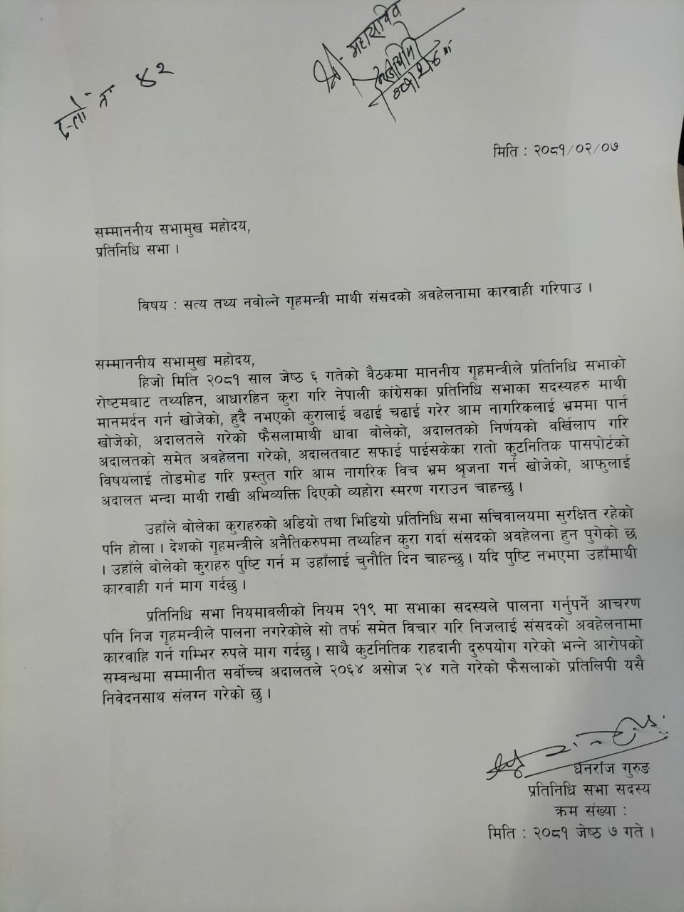 उपसभापति गुरूङले ‘सत्यतथ्य नबोल्ने गृहमन्त्रीमाथि संसदको अवहेलनामा कारबाही गर्न’ मागसहित उनले निवेदन दिएका छन् । गृहमन्त्री लामिछानेले आइतबारको प्रतिनिधि सभाको रोस्टमबाट तथ्यहीन अभिव्यक्ति दिएको गुरूङको भनाइ छ ।