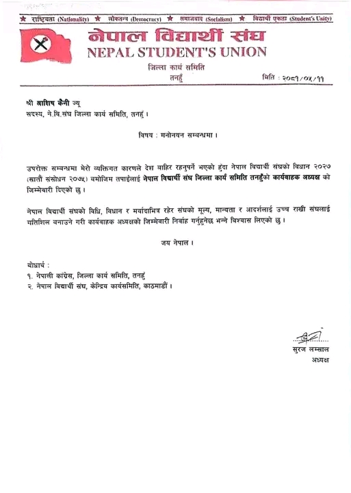 अध्यक्ष सुरज लम्साल व्यक्तिगत कारणले विदेशमा रहने भएकाले जिल्ला सदस्य कैनीलाई कार्यवाहक अध्यक्षको जिम्मेवारी दिएको जनाएको छ ।