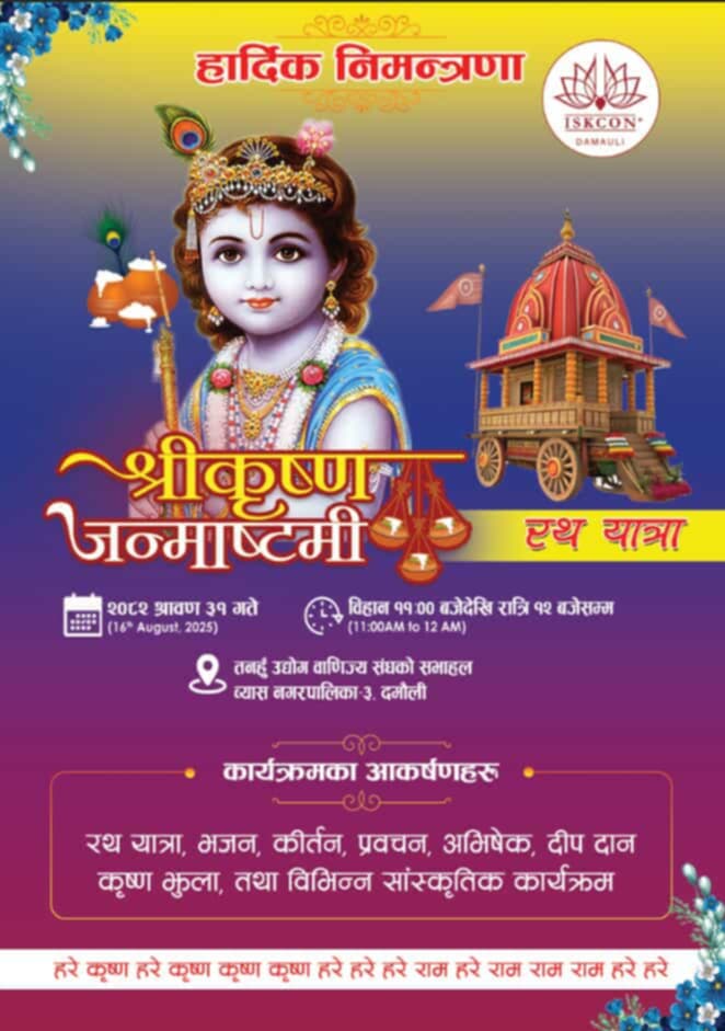 इस्कोन दमौलीले जन्माष्टमी विशेष कार्यक्रम र रथयात्रामा सहभागी हुनका लागि जिल्लाबासी एवं विभिन्न व्यक्तिहरूलाई आग्रह समेत गरेकाे छ ।