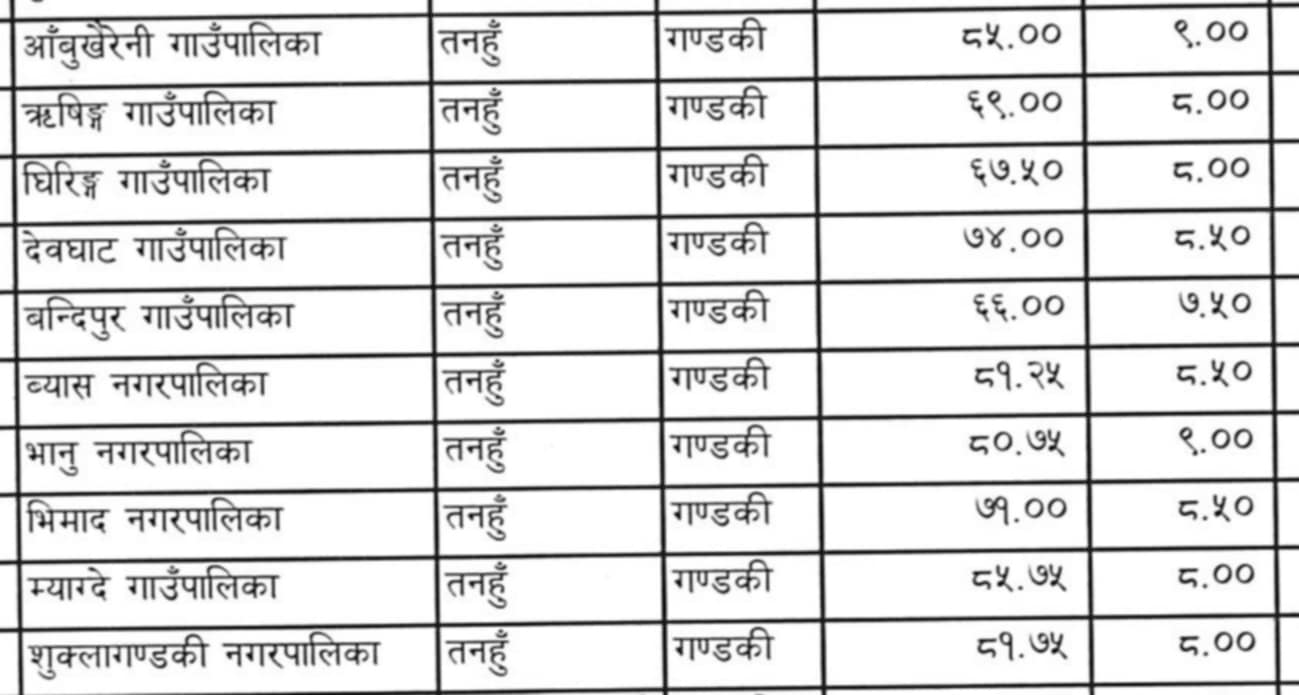 शुक्लागन्डकी नगरपालिका ८१.७५ सहित तेश्रो, व्यास नगरपालिका ८१.२५ अंक सहित चौंथो भएकाे हाे । भानु नगरपालिकाले ८०.७५ अंक, देवघाट गाउँपालिकाले ७४ अंक, भिमाद नगरपालिकाले ७१ अंक, ऋषिङ गाउँपालिका ६९ अंक, घिरिङ गाउँपालिकाले ६७.५० अंक र बन्दीपुर गाउँपालिका ६६ अंकसहित अन्तिम स्थानमा छ ।