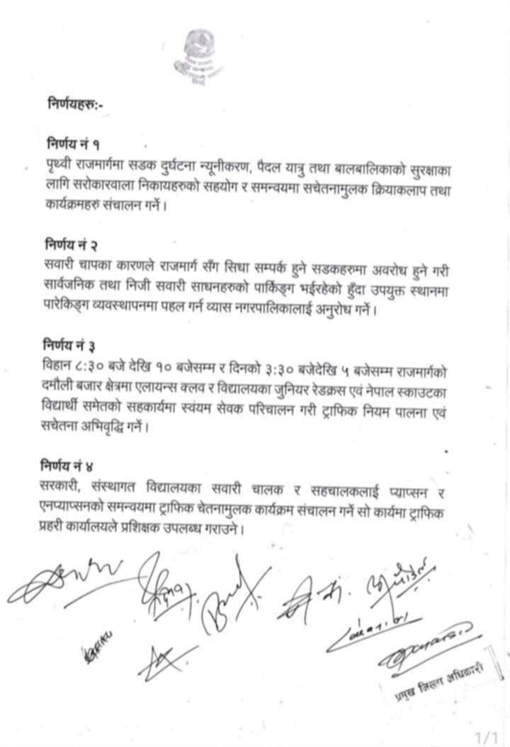बैठकले सडक दुर्घटना न्यूनिकरण, यातायात व्यवस्थापन र यात्री सुरक्षाका लागि विभिन्न ४ बुँदे निर्णय गरेको छ । निर्णयअनुसार, पृथ्वी राजमार्गमा दुर्घटना न्यूनीकरणका लागि सरोकारवाला निकायहरूको सहकार्य र समन्वयमा सचेतनामूलक कार्यक्रम सञ्चालन गरिने छ ।
