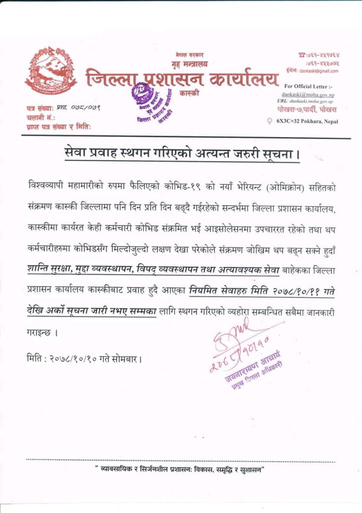 कार्यालयले सोमबार सूचना जारी गर्दै कार्यालयका केही कर्मचारी कोरोना संक्रमित भइ आइसोलेसनमा रहेको र थप कर्मचारीमा समेत लक्षण देखिएकोले शान्तिसुरक्षा, मुद्दा व्यवस्थापन, विपद् व्यवस्थापन तथा अत्यावश्यक सेवाबाहेकका अन्य सेवा माघ ११ देखि स्थगन गरिएको जानकारी दिएको हो ।