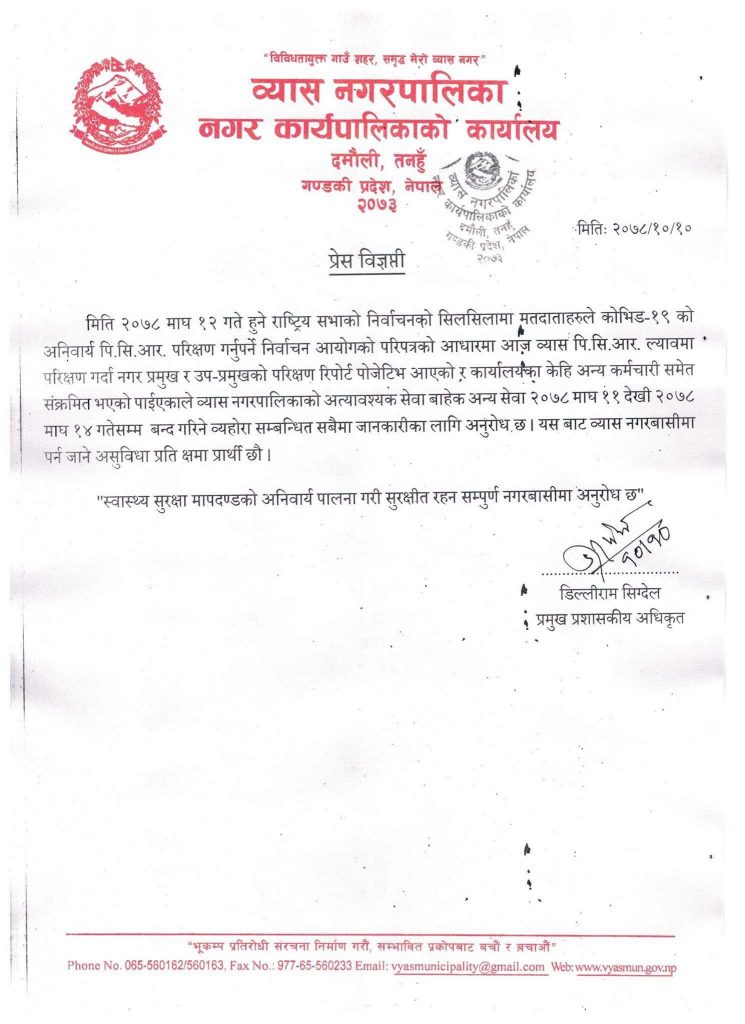 नगरका प्रमुख प्रशासकीय अधिकृत डिल्लीराम सिग्देलद्वारा जारी एक सूचनामा माघ १२ गते हुने राष्ट्रिय सभाको निर्वाचनका लागि गरिएको पीसीआर परिक्षणका क्रममा व्यास नगर प्रमुख र उप–प्रमुखको कोरोना परिक्षण रिपोर्ट पोजेटिभ आएको उल्लेख गरिएको छ ।कर्मचारी समेत संक्रमित भएको पाईएकाले व्यास नगरपालिकाको अत्यावश्यक बाहेकका सेवा मंगलबार माघ ११ देखि १४ गतेसम्म बन्द गरिने बताएका छन् ।