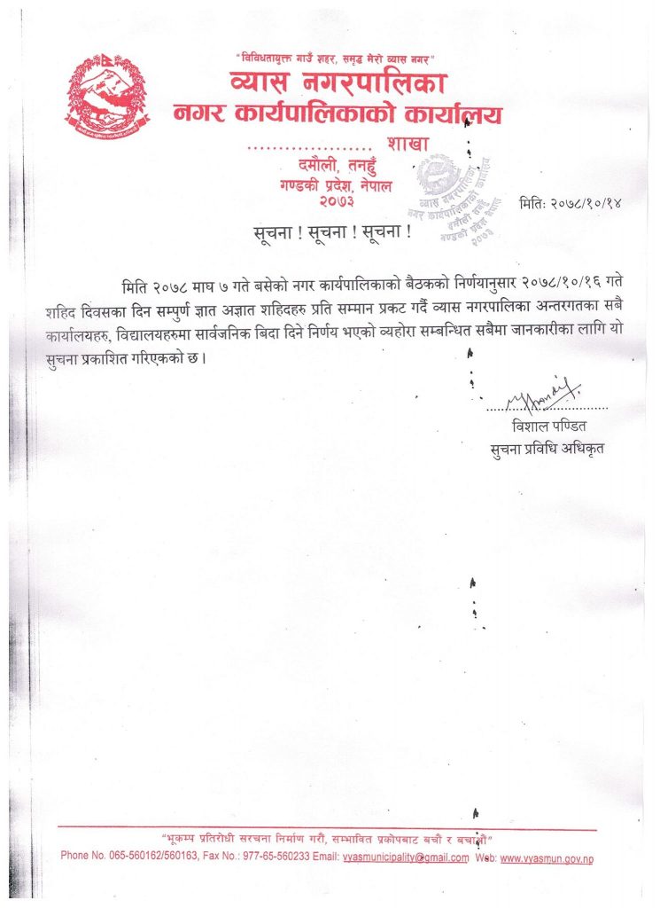 दमौली : तनहुँको व्यास नगरपालिकाले शहिद दिवसका दिन सरकारी विदाको घोषणा गरेको छ। नगरपालिकाले शुक्रवार प्रेस विज्ञप्ती जारी गर्दै माघ १६ गतेका दिन शहिद दिवसको अवसरमा सार्वजनिक विदा दिने जनाएको छ।