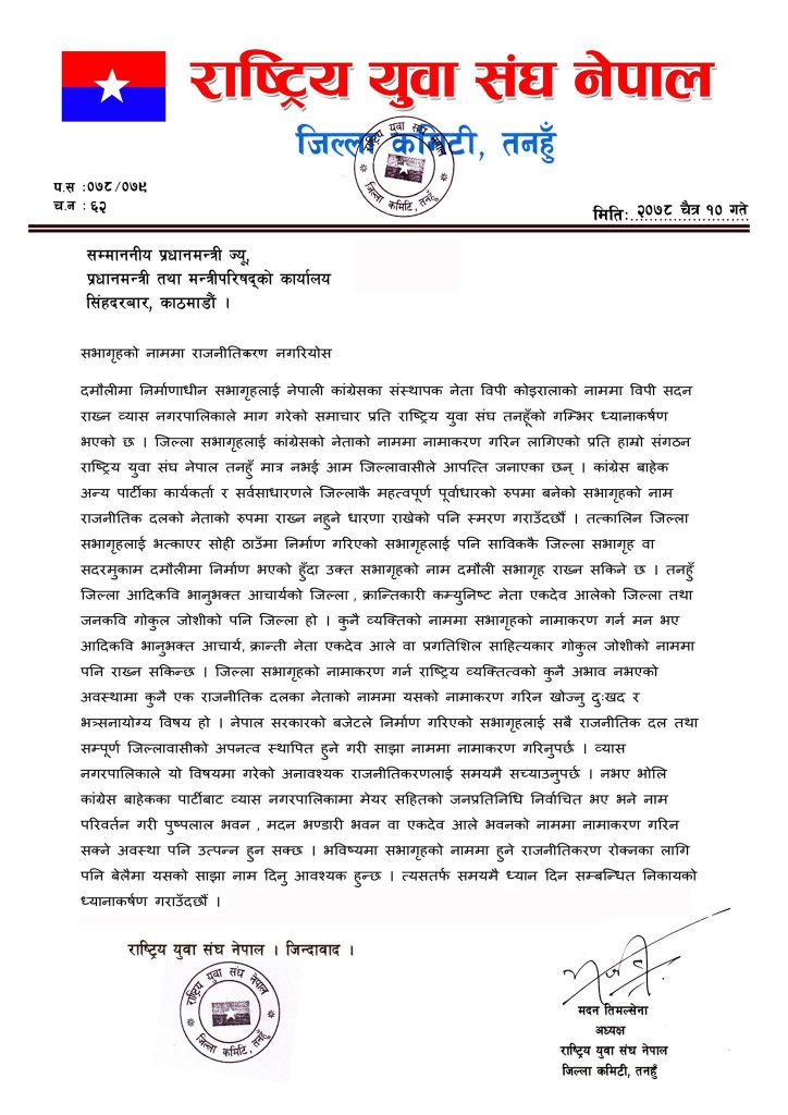 राष्ट्रिय युवा संघ नेपाल जिल्ला कमिटी तनहूँका अध्यक्ष मदन तिमल्सेनाले प्रधानमन्त्री देउवालाई ज्ञापन पत्र बुझाउदै सरकारी बजेटबाट निर्माण भएको सभागृहको नाम सबै राजनितीक दल र सम्पूर्ण जिल्लावासीको अपनत्व हुने गरि साझा नाममा नामाकरण गरिनुपर्ने आग्रह गरेको हुन ।