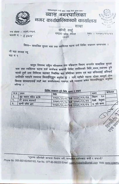 तनहुँ: व्यास नगरपालिका वडा नं. १ वडा कार्यालयले रास्ट्रिय परिचयपत्र तथा पंजीकरण बिभाग अन्तर्गत सामाजिक सुरक्षा भत्ता तथा व्यक्तिगत घटना दर्ता शिबिर संचालन हुने भएको छ।