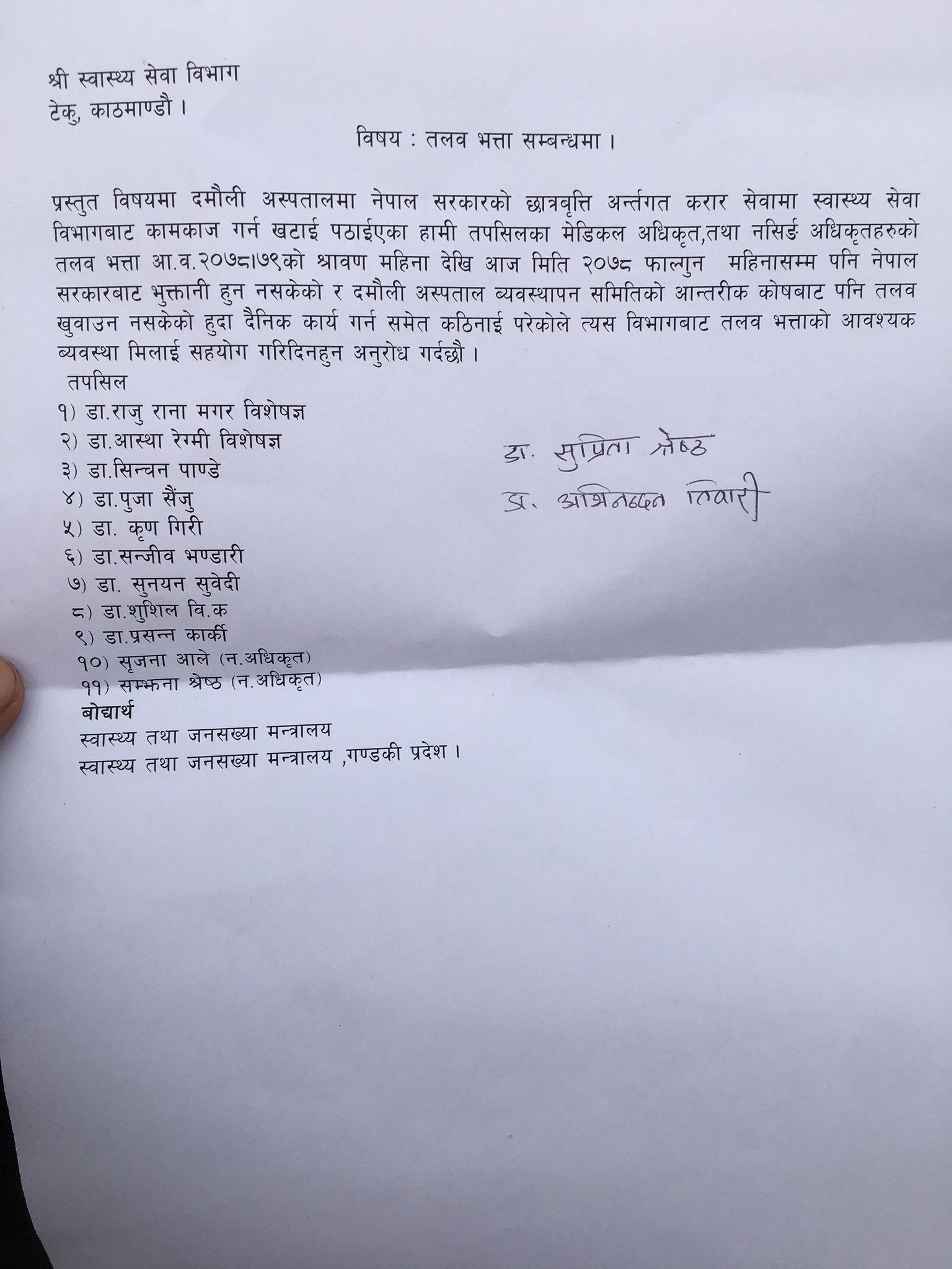 नेपाल सरकारको छात्रवृत्तिअन्तर्गत करार सेवामा स्वास्थ्य सेवा विभागबाट कामकाज गर्न खटाई पठाइएका मेडिकल अधिकृत, नर्सिङ अधिकृतको तलबभत्ता भुक्तानी हुन् नसकेको र दमौली अस्पताल व्यवस्थापन समितिको आन्तरिक कोषबाट पनि तलब खुवाउन नसकेको हुँदा दैनिक कार्य गर्न कठिनाई भएको चिकित्सकले जनाएको छ ।