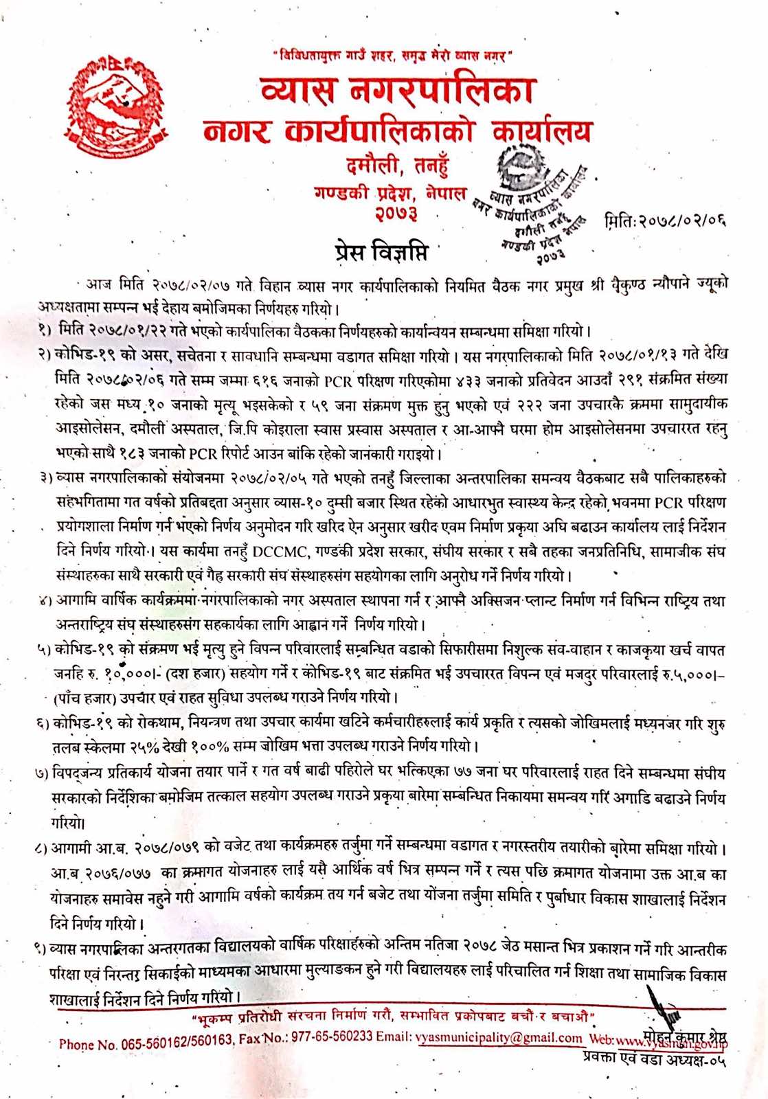 साथै व्यास नगरपालिका अन्तरगतका विद्यालयको वार्षिक परिक्षाहरुको अन्तिम नतिजा २०७८ जेठ मसान्त भित्र प्रकाशन गर्ने गरि आन्तरीक परिक्षा एवं निरन्तर सिकाईको माध्यमका आधारमा मुल्याङकन हुने गरी विद्यालयहरु लाई परिचालित गर्न शिक्षा तथा सामाजिक विकास शाखालाई निर्देशन दिने निर्णय भएको छ ।