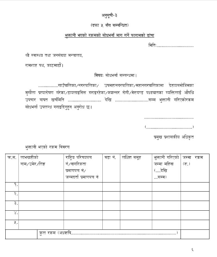स्वास्थ्य तथा  जनसंख्या मन्त्रालयको नीति, योजना तथा अनुगमन महाशाखा देशभरका ७ सय ५३ पालिकाबाट यो रकम उपलब्ध गराउन कार्यविधि कार्यान्वयनका लागि पत्राचार गरिसकेको छ । अब स्थानीय पालिकाले यस्ता बिरामीको लगत संकलन गर्नेछ । लगत संकलन पछि नाम अध्यावधिक गरिने छ र त्यो तथ्याङ्क पालिकाले स्वास्थ्य मन्त्रालयमा पठाउनेछ । त्यसपछि बिरामीको खातामा रकम पठाइने स्वास्थ्य मन्त्रालयलले जनाएको छ ।