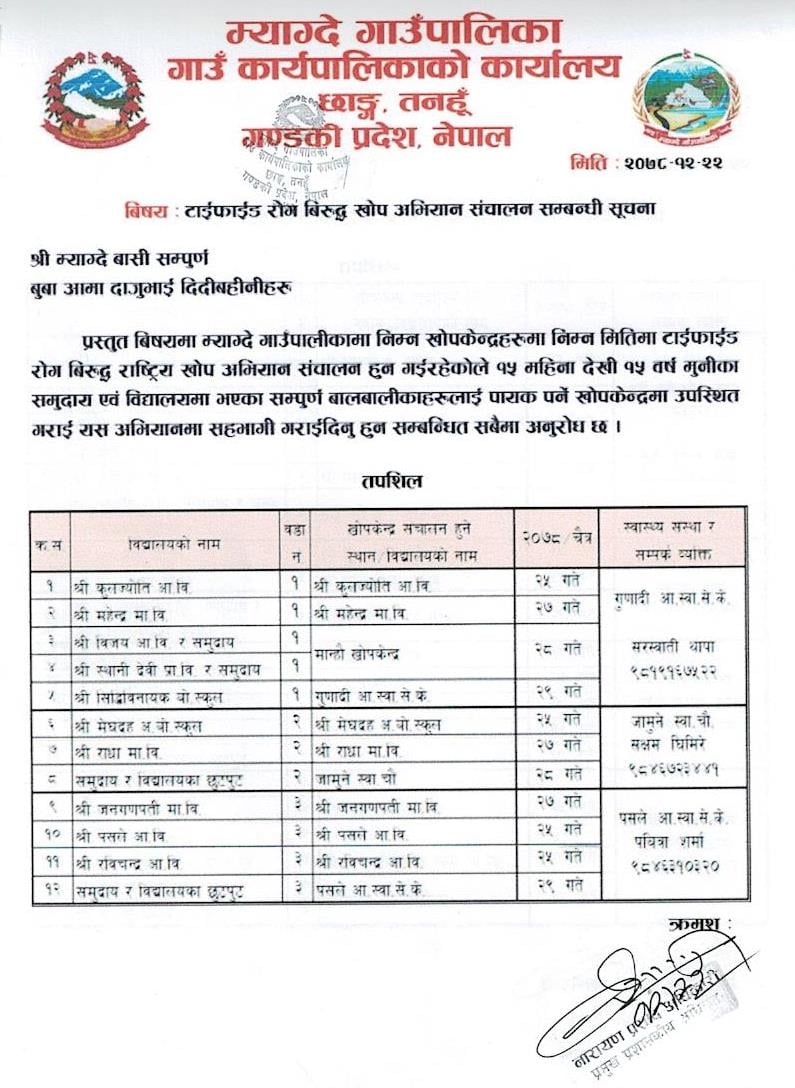म्याग्देमा २५ गते देखि टाइफाइडविरुद्धको खोप अभियान (सुची सहित )