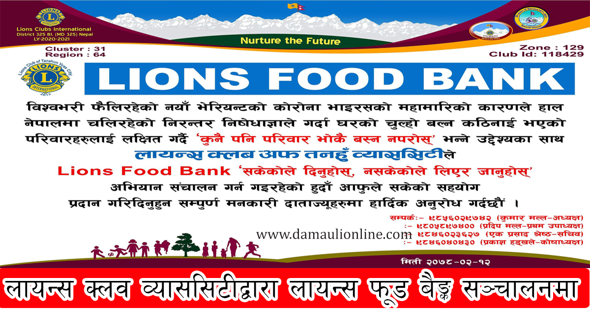 नयाँ भेरियन्ट सहितको दोस्रो लहरको कोरोना संक्रमण बढ्दै गएको परिस्थितिमा निषेधाज्ञाको कारण समस्यामा परेका विपन्न परिवारलाई लक्षित गर्दै लायन्स क्लव अफ तनहुँ व्याससिटी द्वारा ‘लायन्स फूड बैङ्क’ अभियानको सुरुवात गरेको छ ।