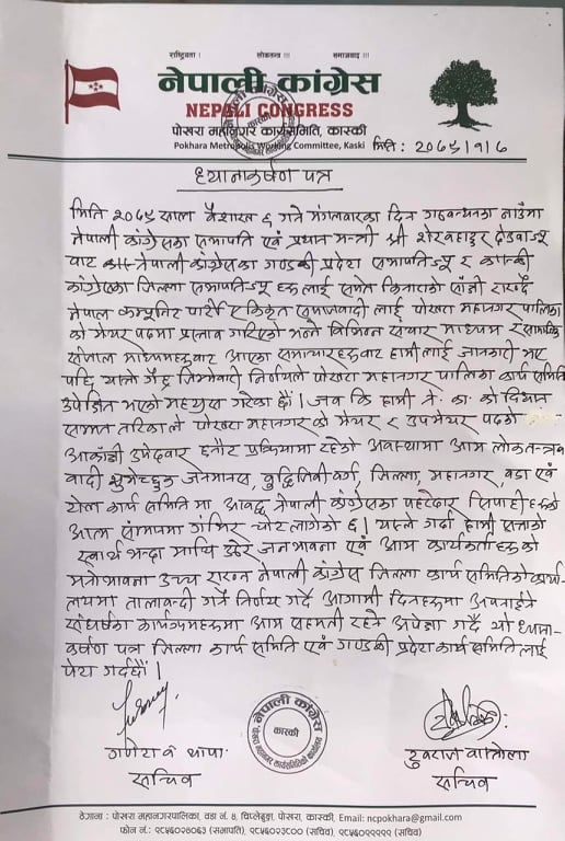 ‘आगामी दिनमा अपनाइने संघर्षका कार्यक्रममा आमसहमति रहने अपेक्षा गर्दै यो ध्यानाकर्षण पत्र जिल्ला कार्यसमिति एवं गण्डकी प्रदेश कार्य समिति लाई पेस गर्दर्छौं,’ विज्ञप्तिमा भनिएको छ ।
