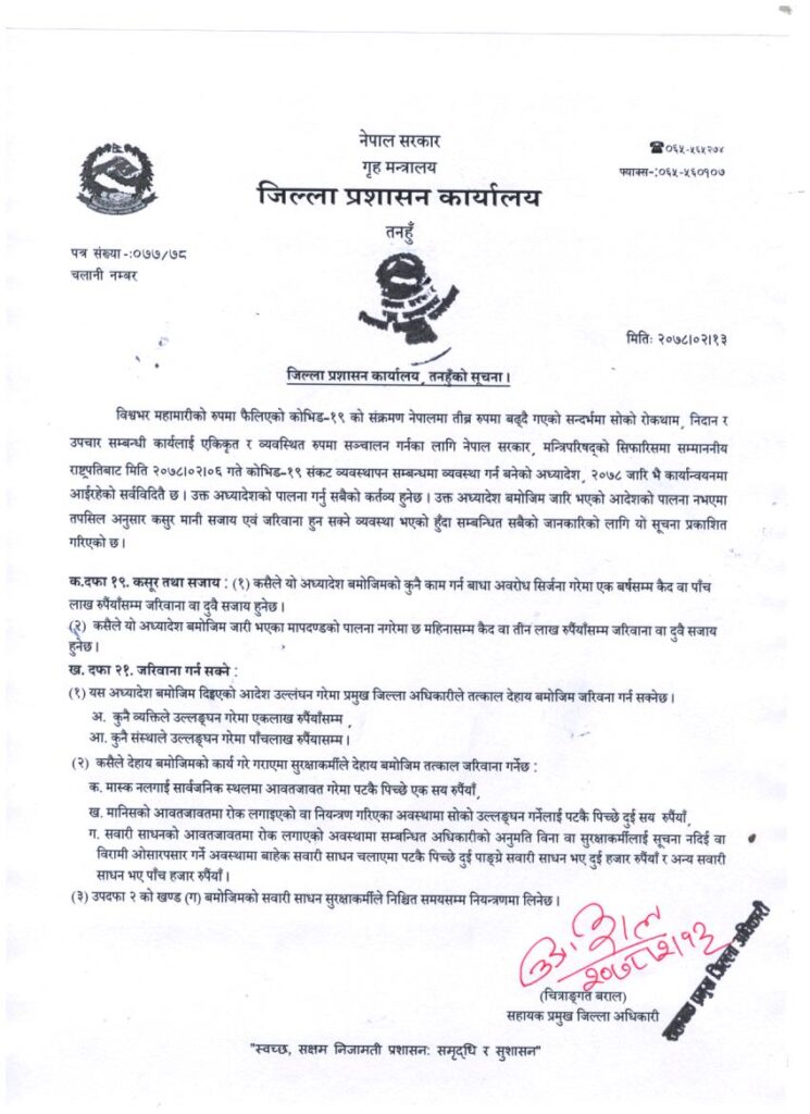 बिहिबार जिल्ला प्रशासन कार्यालयले सूचना जारी गर्दै उल्लङ्घन गर्नेलाई दण्ड र जरिवाना समेत कार्यन्वयन गर्ने निर्णय भएको हो । नेपाल सरकारको कोभिड व्यवस्थापन सम्बन्धी २०७८ मा जारी गरेका अध्यादेशअनुसार कोही कसैले मापदण्ड पालना नगरेमा नगद, कैद वा दुवै सजाय हुन सक्ने उल्लेख छ ।