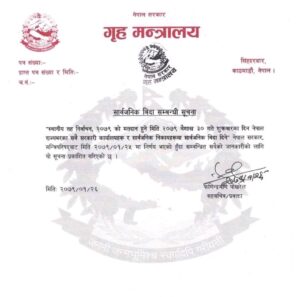 गृह मन्त्रालयले सोमबार विज्ञप्ति जारी गर्दै नेपालभरिका सबै सरकारी र सार्वजनिक निकायमा विदा दिने जानकारी दिएको छ।