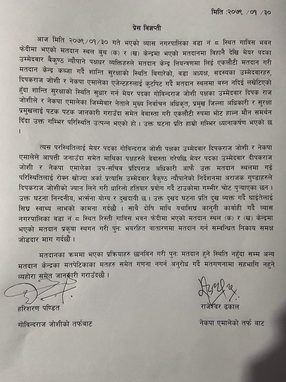 शान्ति सुरक्षाको स्थिति बिगारेको, वडाध्यक्ष, सदस्यका उम्मेदवारहरु, दीपकराज जोशी र नेकपा एमालेका एजेन्टहरुलाई कुटपिट गदै मतदानस्थलमा बस्न नदिई लखेटिएको र शान्ति सुरक्षाको स्थिति सुधार गर्न दीपकराज जोशी र नेकपा एमालेका नेताले मुख्य निर्वाचन अधिकृत, प्रमुख जिल्ला अधिकारी र सुरक्षा प्रमुखलाई पटक पटक जानकारी गराउँदा समेत वेवास्ता गरी एकलौटी रुपमा भोट हाल्न मौन समर्थन दिँदा उक्त परिस्थिति उत्पन्न भएको विज्ञप्तीमा उल्लेख छ ।